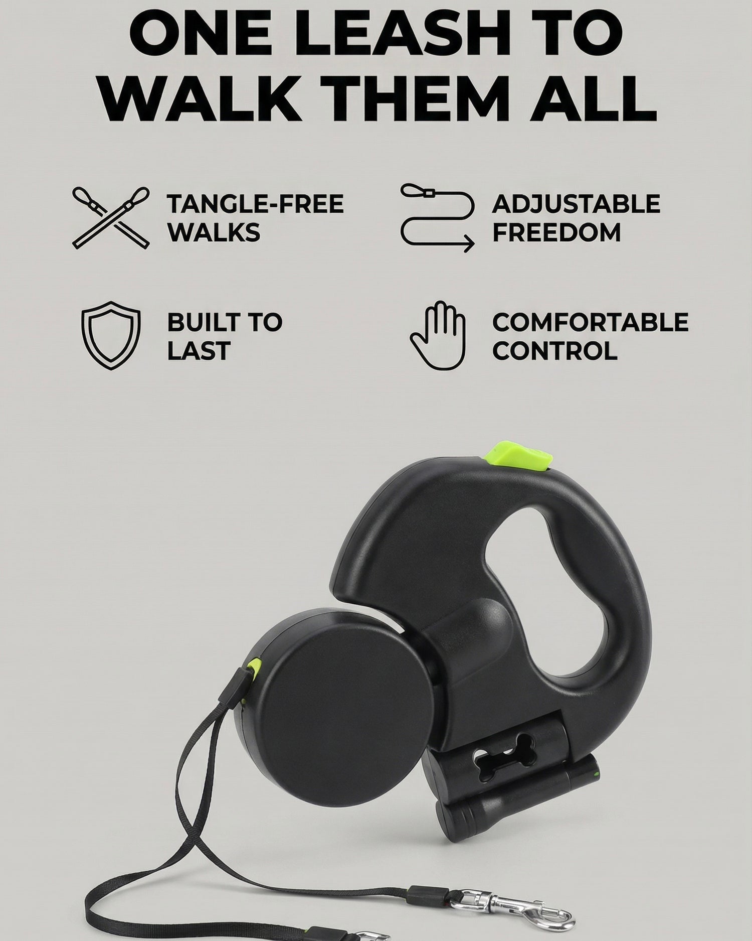 Dual-Head Design: Walk two dogs simultaneously with one leash—each line extends independently up to 3 meters for tangle-free control.